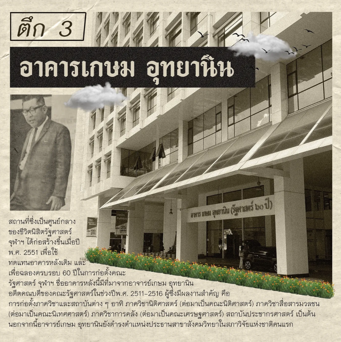 สำหรับหมุดหมายแรกที่เราจะพาไปรู้จักก็คือ อาคารเกษม อุทยานิน หรือที่เรามักเรียกกันว่าตึก 3 ซึ่งเป็นอาคารที่เพื่อน ๆ จะต้องรู้จักและใช้งานมันอยู่เป็นประจำเลยก็ว่าได้ เนื่องจากว่าเป็นอาคารเรียนสำหรับนิสิตในระดับปริญญาตรีทุกชั้นปี นับตั้งแต่เราก้าวเข้ามาเป็นนิสิตใหม่ในคณะจนกระทั่งจบออกไปเป็นบัณฑิตเต็มตัวนั่นเอง โดยสำหรับอาคารเกษม อุทยานินนี้ก่อสร้างขึ้นเมื่อปีพ.ศ. 2551 เพื่อใช้ทดแทนอาคารเกษม อุทยานินหลังเดิม และเพื่อฉลองครบรอบ 60 ปีของการก่อตั้งคณะรัฐศาสตร์ โดยอาคารแห่งนี้เรียกได้ว่าเป็นศูนย์กลางของชีวิตนิสิตในคณะนี้เลยก็ว่าได้ เนื่องจากเพียบพร้อมไปด้วยสารพัดสถานที่ เช่น ห้องสมุด ห้องพักอาจารย์ ห้องเรียน ไปจนถึงฝ่ายกิจการนิสิตและสำนักงานของคณบดี นอกจากนี้ บริเวณชั้น 1 ยังมีร้านคาเฟ อเมซอนและ U-Store ไว้รองรับเพื่อน ๆ ที่ต้องการเครื่องดื่มเย็น ๆ หรือต้องการคำแนะนำเกี่ยวกับอุปกรณ์อิเล็กทรอนิกส์ที่จะต้องใช้ในการเรียน