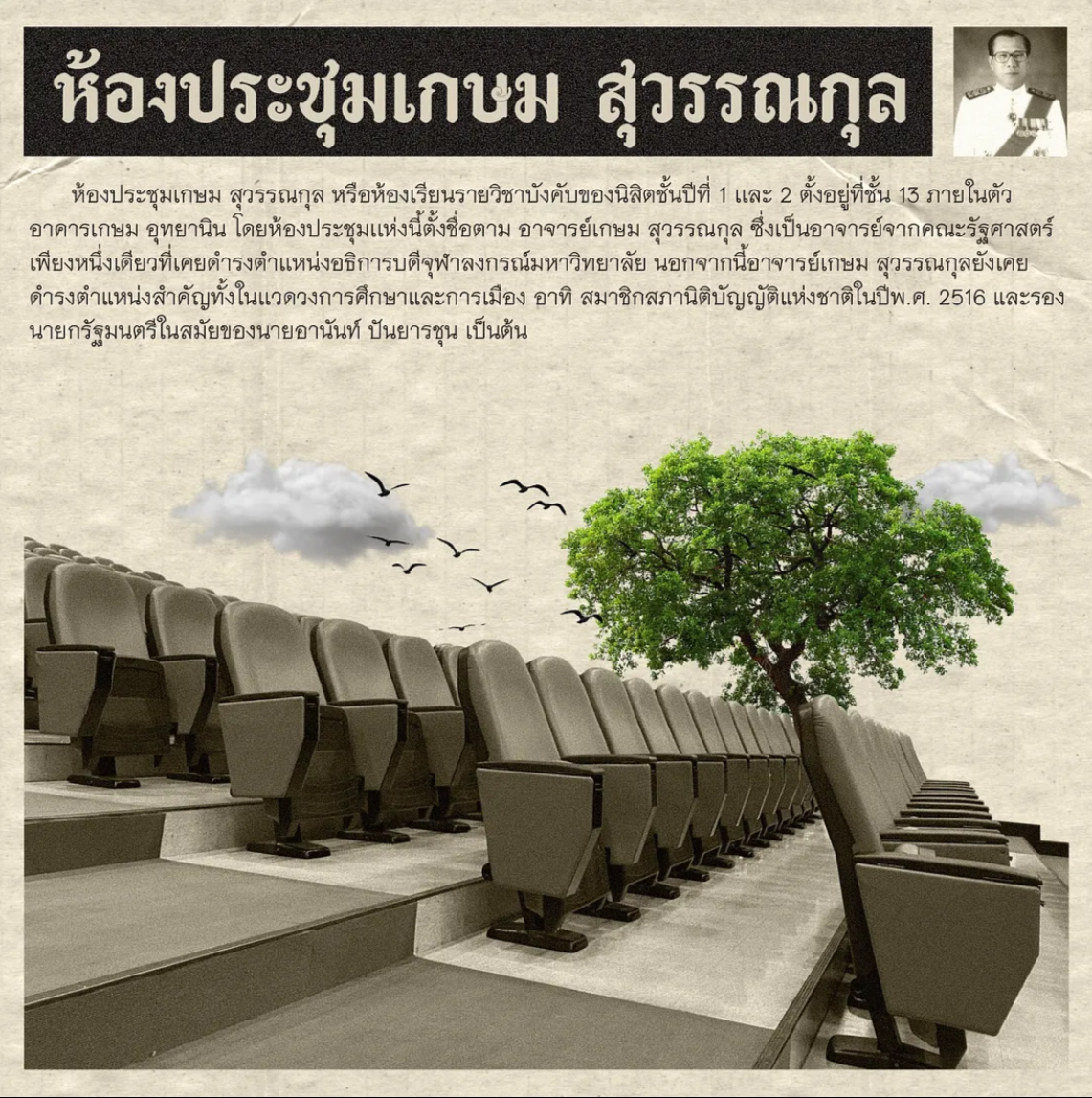 ต่อจากตัวอาคารที่เราต้องใช้งานอยู่ทุกวัน ก็จะเป็นตัวของห้องและสถานที่สำคัญภายในอาคารกันบ้าง ซึ่งจุดแรกที่เราจะพาไปรู้จักในตัวอาคารเกษม อุทยานินก็คือ “ห้องประชุมเกษม สุวรรณกุล” ที่ชั้น 13 ซึ่งเป็นห้องที่เราใช้เรียนในรายวิชาบังคับ ของปี 1 เกือบทั้งหมด และรายวิชาบังคับของปี 2 อีกบางส่วนด้วย