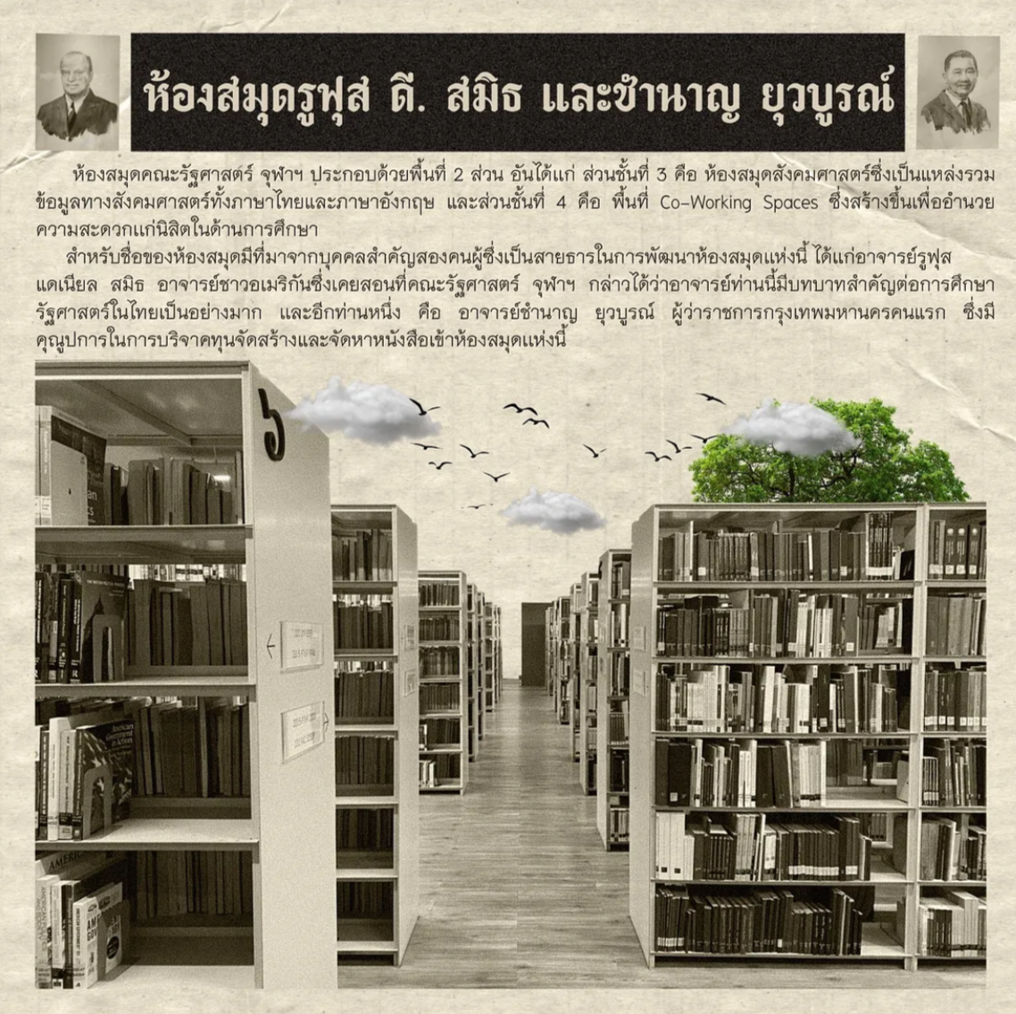 ห้องสมุดแห่งนี้ประกอบด้วยพื้นที่ 2 ส่วน คือส่วนของห้องสมุดสังคมศาสตร์ ซึ่งรวมแหล่งข้อมูลทางสังคมศาสตร์ทั้งภาษาไทยและภาษาอังกฤษ และอีกส่วนที่อยู่ชั้น 4 ก็คือพื้นที่ Co-Working Spaces สำหรับนิสิตในคณะที่ต้องการพักผ่อน ประชุมงาน หรือติวสอบ ซึ่งจะขยายเวลาเปิดให้สำหรับนิสิตคณะรัฐศาสตร์ในช่วงที่เรียกว่า “เข้าเดือน” ซึ่งก็หมายถึงช่วงการสอบกลางภาคและปลายภาคนั่นเอง