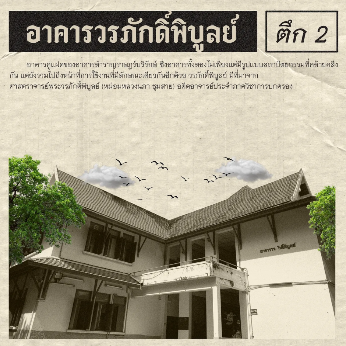 ต่อจากอาคารสำราญราษฎร์บริรักษ์ ก็มีอีกอาคารที่ตั้งอยู่คู่กันและมีรูปทรงใกล้เคียงกันมาก อาคารนี้มีชื่อว่า “อาคารวรภักดิ์พิบูลย์” โดยตั้งชื่อตามศาสตราจารย์พระวรภักดิ์พิบูลย์ (หม่อมหลวงนภา ชุมสาย) ซึ่งเป็นหนึ่งในอาจารย์ประจำภาควิชาการปกครองในยุคแรก อาคารนี้มีหน้าที่การใช้งานที่ใกล้เคียงกับอาคารคู่แฝดอย่างอาคารสำราญราษฎร์บริรักษ์ นั่นคือเป็นอาคารเรียนสำหรับนิสิตในระดับบัณฑิตศึกษา และเป็นห้องพักอาจารย์ในภาควิชาการปกครอง แต่สิ่งที่แตกต่างออกไปคือ ที่นี่ใช้เป็นอาคารสำนักงานหลักสูตรการพัฒนาระหว่างประเทศ และศูนย์ศึกษาการพัฒนาสังคม