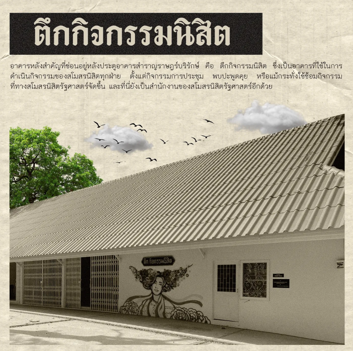 เมื่อเราเดินออกมาจากอาคารสำราญราษฎร์บริรักษ์ โดยเดินตรงมาจากทางเข้า ก็จะพบกับอาคารสำคัญอีกหลังหนึ่ง นั่นคือ “ตึกกิจกรรมนิสิต” ที่นี่เป็นอาคารที่ใช้ในการดำเนินกิจกรรมของสโมสรนิสิตทุกฝ่าย ตั้งแต่กิจกรรมการประชุม พบปะพูดคุย หรือแม้กระทั่งใช้ซ้อมกิจกรรมที่ทางสโมสรนิสิตรัฐศาสตร์จัดขึ้น และที่นี่ยังเป็นสำนักงานของสโมสรนิสิตรัฐศาสตร์อีกด้วย