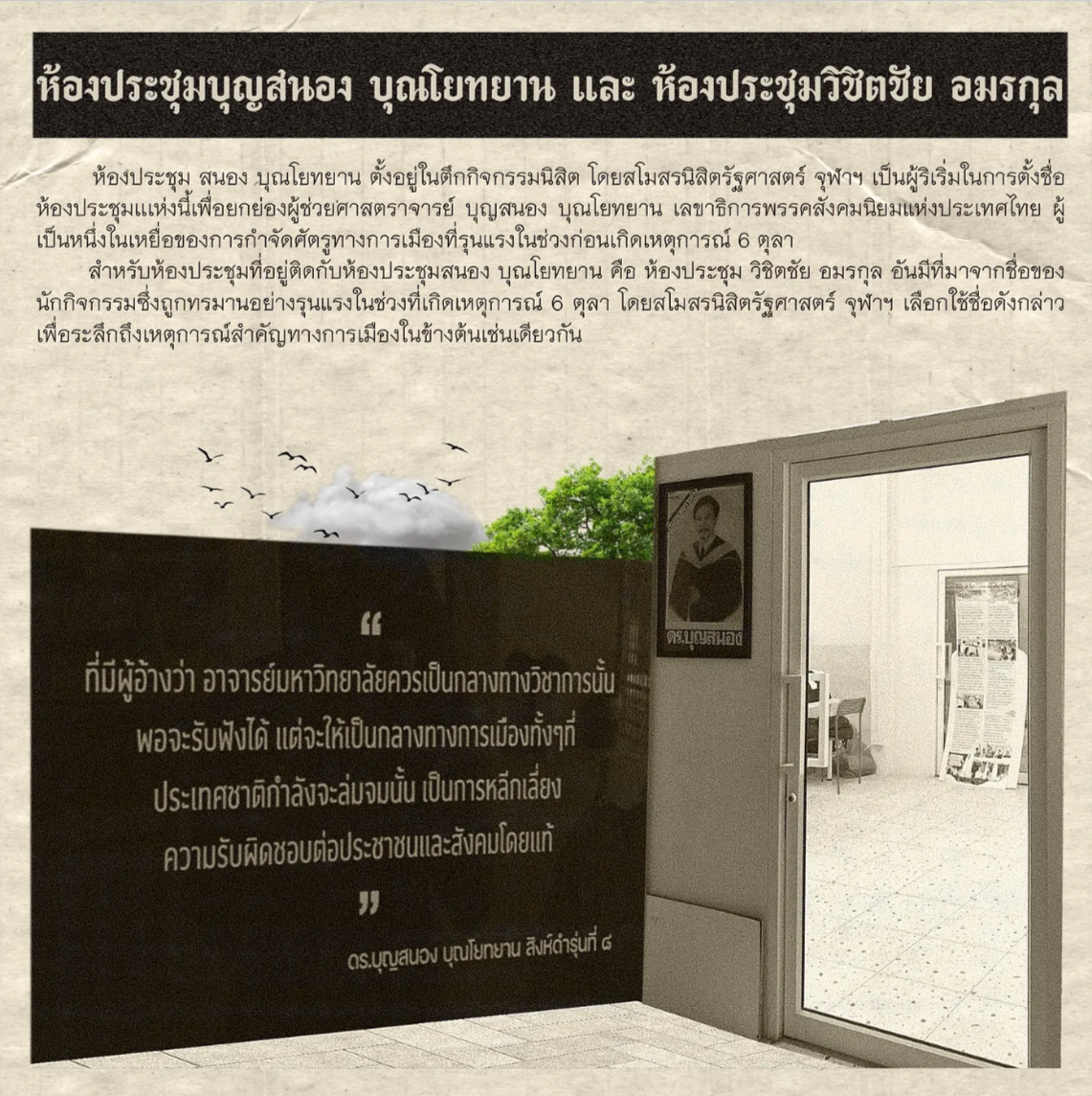 สำหรับสถานที่สุดท้ายที่เราจะพาเพื่อน ๆ ทุกคนไปทำความรู้จักก็คือ ห้องประชุมสนอง บุณโยทยาน ซึ่งตั้งอยู่ในตึกกิจกรรมนิสิตนั่นเอง โดยห้องประชุมนี้พึ่งได้ชื่อนี้มาเมื่อปี พ.ศ. 2563 โดยที่ทางสโมสรนิสิตรัฐศาสตร์ในเวลานั้นต้องการจะยกย่องผู้ช่วยศาสตราจารย์ บุญสนอง บุณโยทยาน ซึ่งเป็นเลขาธิการพรรคสังคมนิยมแห่งประเทศไทย และเป็นหนึ่งในเหยื่อของการกำจัดศัตรูทางการเมืองที่รุนแรงในช่วงก่อนเกิดเหตุการณ์ 6 ตุลา จึงได้นำเอาชื่อของท่านมาตั้งเป็นชื่อห้องประชุมห้องหนึ่งในตึกกิจกรรมนิสิต และห้องประชุมอีกห้องที่อยู่ติดกันก็ได้ใช้ชื่อของ วิชิตชัย อมรกุล นักกิจกรรมซึ่งถูกทรมานอย่างรุนแรงในช่วงที่เกิดเหตุการณ์ 6 ตุลาเพื่อระลึกถึงเช่นกัน